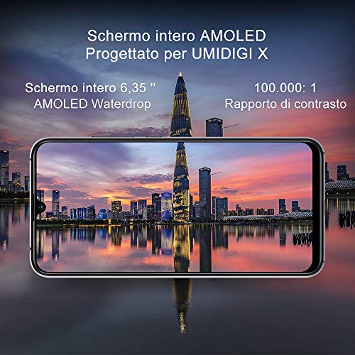 【AMOLED Full Screen】Il display costruito appositamente per UMIDIGI X offre colori sbalorditivi come mai prima d’ora. Vivrai un’esperienza visiva immerso nella precisione dei colori, con neri più profondi e con maggiore luminosità e contrasto, ideali per guardare video e giocare.